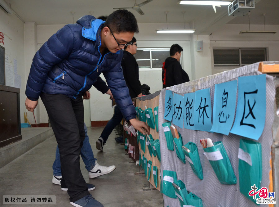 3月17日,大学生将手机放入多功能手机休息区,安心上课。中国网图片库 作者:许文豪