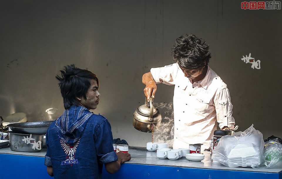 云南省瑞丽市德龙珠宝夜市上,两位年轻人正在倒咖啡。