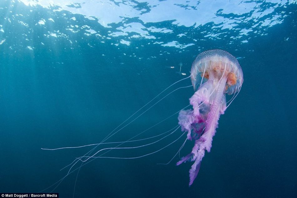 潜水员潜水时,拍摄到了隐藏在这片海域海底罕见的紫色水母。(网站截图)