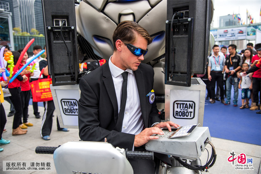 2015年3月31日,英国超级机器人Titan(泰坦)首次登陆中国,在深圳会展中心广场亮相,英国帅哥正在操控机器人Titan。中国发展门户网 邓飞/摄