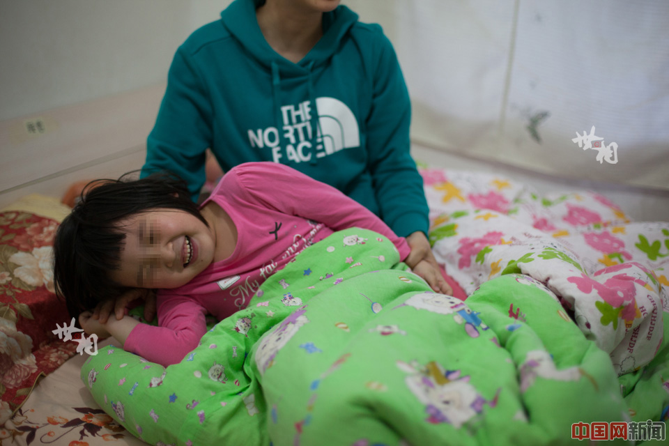 中午,在出租屋内,小琪起床后和另外一位自闭症儿童的母亲在玩闹。