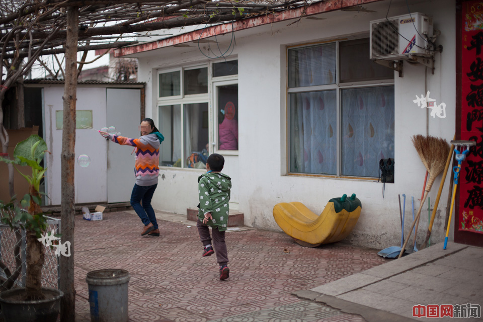 小辉喜欢吹泡泡,图为小辉追逐着妈妈吹出的泡泡。