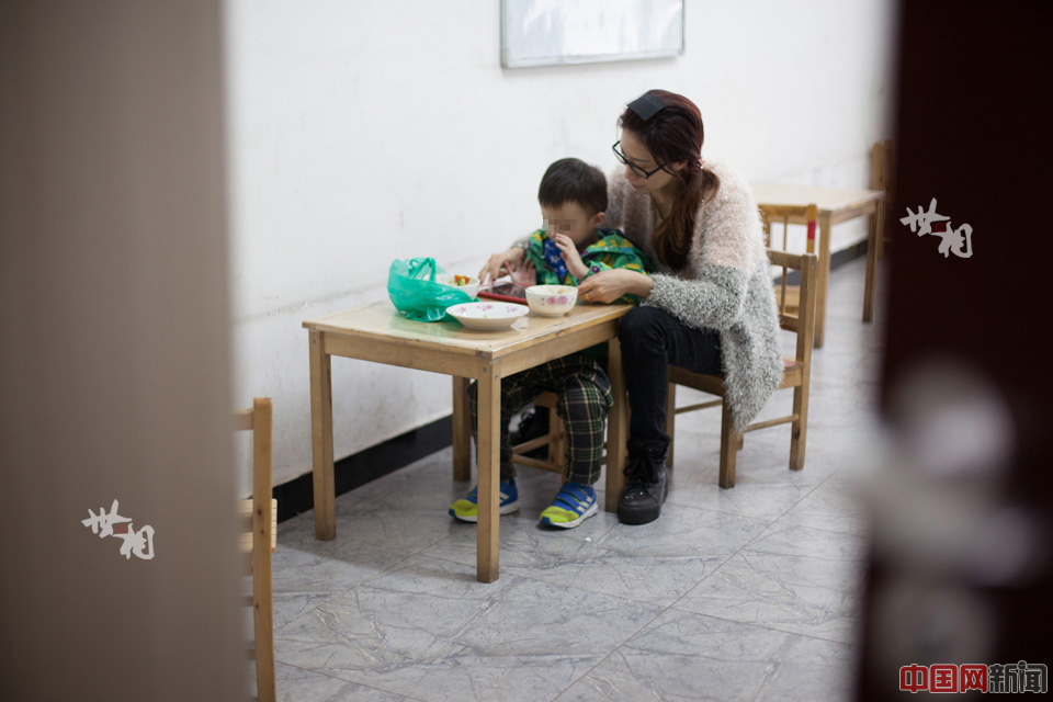 午休时,其他的小朋友都回去休息了,小雨的妈妈请老师教他怎样一个人吃饭。图为跟老师学习完吃饭后,小雨的妈妈想让小雨再多吃一点,但他有些抗拒。