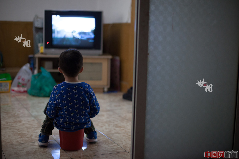 小雨喜欢看电视,尤其爱看歌唱节目。图为小雨坐在便桶上,观看电视节目。