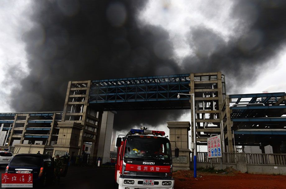 4月7日,消防车通过事故现场大门。据福建省安监局消息,4月6日18时56分许,漳州市古雷腾龙芳烃二甲苯装置发生漏油起火事故,已致6人受伤,其中5人被玻璃刮伤,已送医院救治。新华社记者魏培全摄