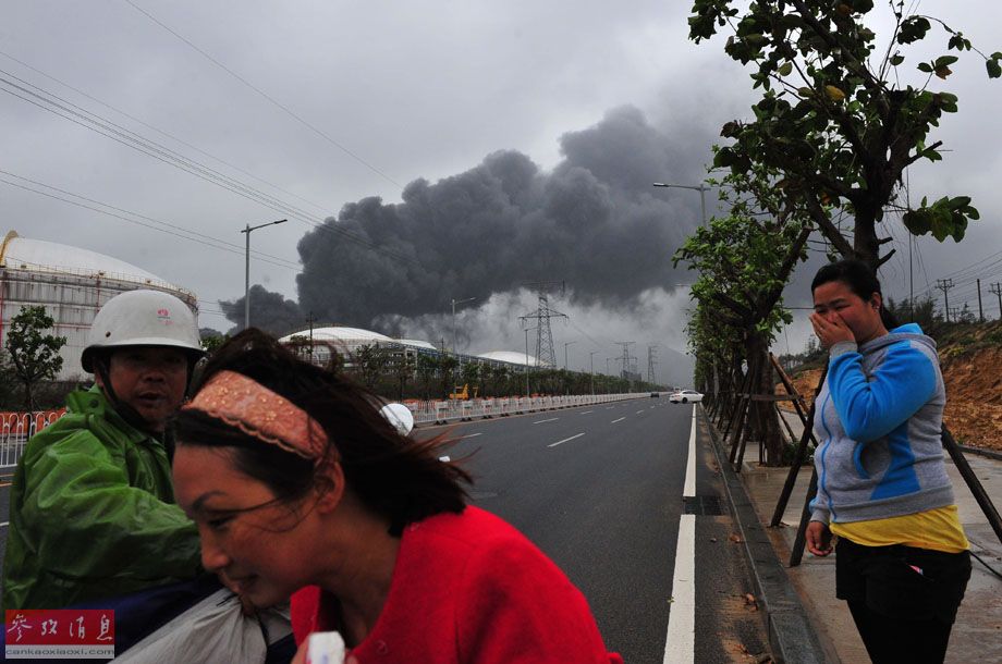 4月7日,事故现场周边群众正在撤离。据福建省安监局消息,4月6日18时56分许,漳州市古雷腾龙芳烃二甲苯装置发生漏油起火事故,已致6人受伤,其中5人被玻璃刮伤,已送医院救治。新华社记者魏培全摄