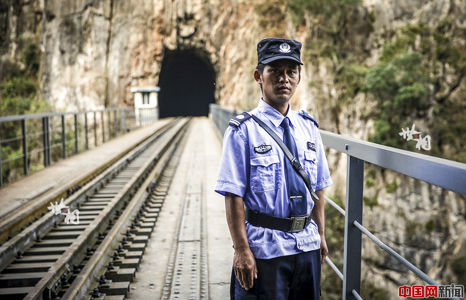 3月30日,35岁的苗族守卫队成员熊俊在滇越铁路人字桥上。已退休的芷村车站派出所的民警王开林组织当地苗族村民成立了15人的“人字桥看守队”的保安队员,他们每天24小时精心守护着这座百年钢桥。