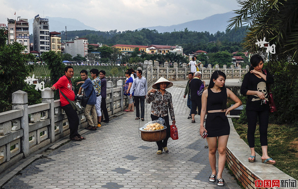 4月3日,一位越南小贩在云南省河口市中越边境附近和一些中国游客相遇,河对岸便是越南,许多游客从河口通过中越大桥进入越南旅游。