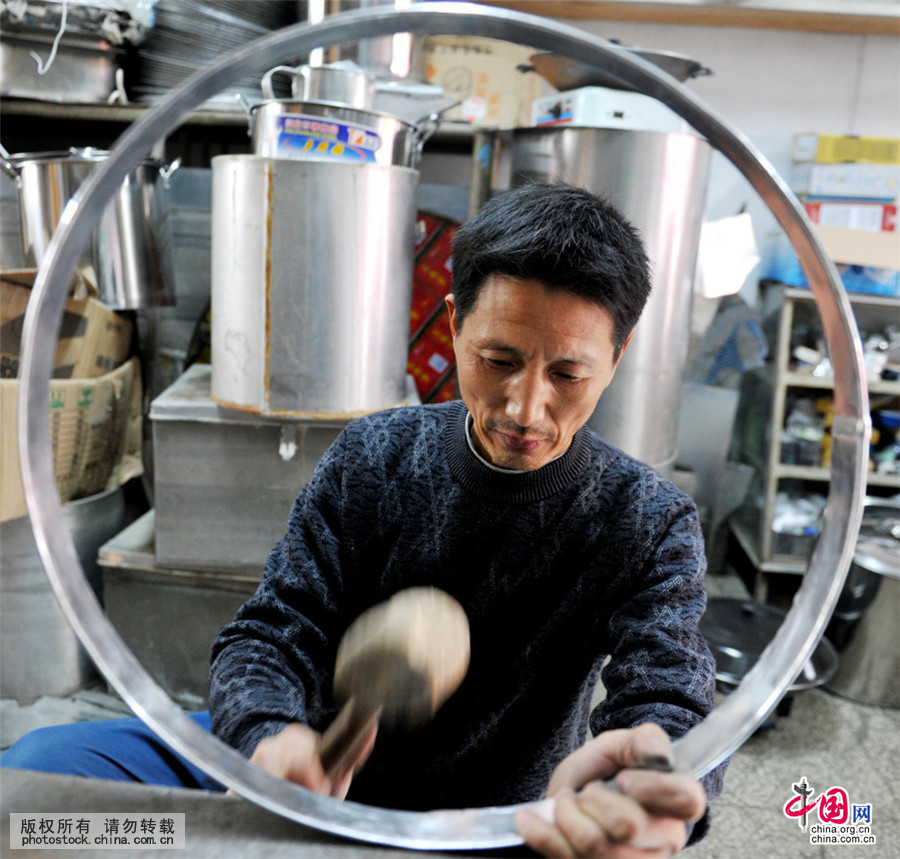 4月9日,江西省德兴市泗洲镇民间铁皮工匠汪光耀正在用铁皮为客户制作生活器具。中国网图片库 卓忠伟/摄