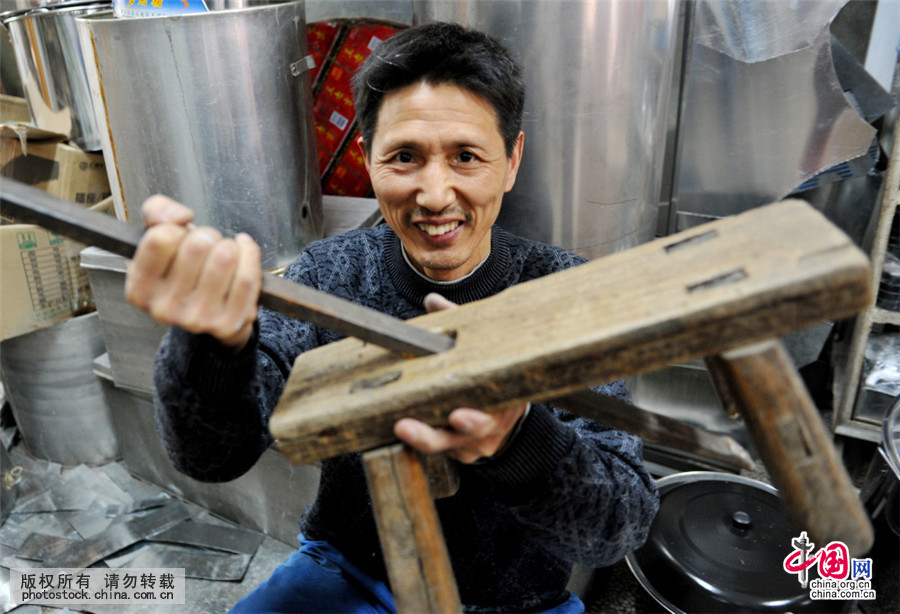 4月9日,江西省德兴市泗洲镇民间铁皮工匠汪光耀开心展示出跟了他30多年做工匠的必备木质工具。中国网图片库 卓忠伟/摄