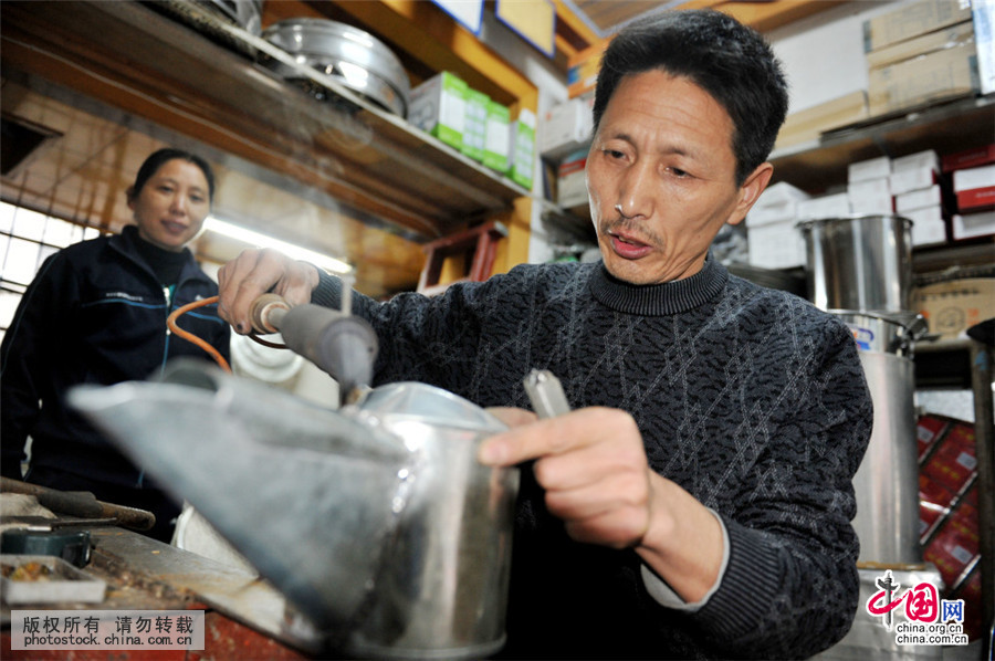 4月9日,江西省德兴市泗洲镇民间铁皮工匠汪光耀必要时也与时俱进,用上了电烙铁这一现代工具。中国网图片库 卓忠伟/摄