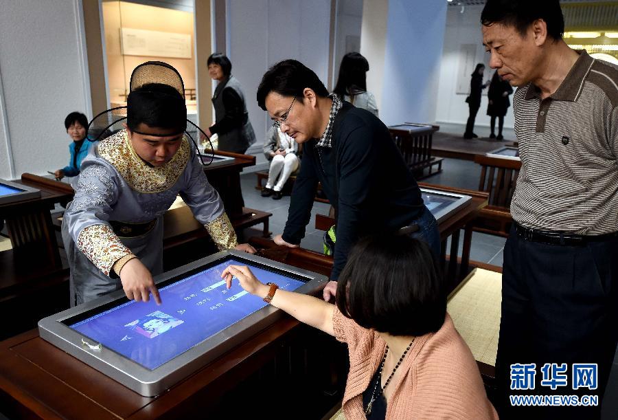 4月11日,游客在隋唐洛阳城国家遗址公园明堂内利用多媒体设备体验科举考试。 新华社记者李安摄