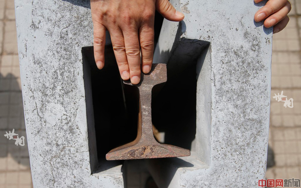 杨宗信抚摸着铁轨标志柱。这根标志柱是用水泥外壳包住了一根1905年的钢轨,体现了展览的古今通汇和东西文化交融。