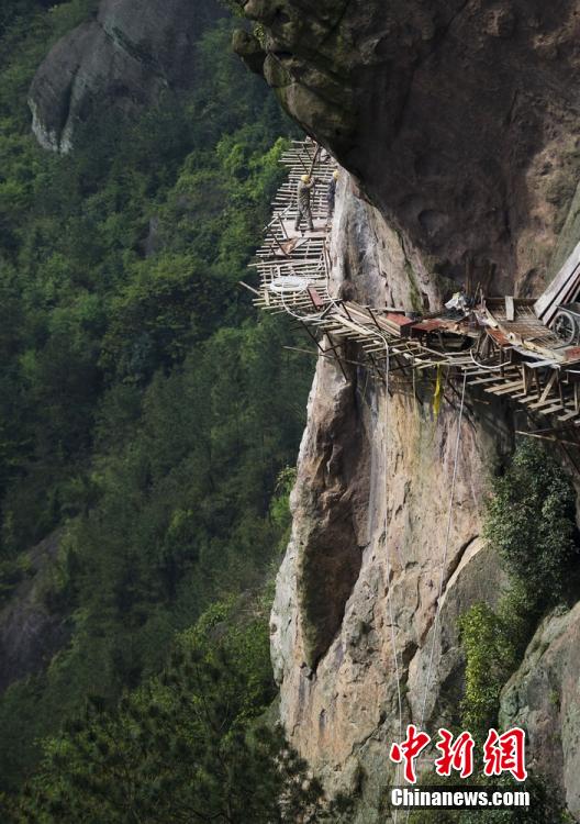 栈道工 行走 悬崖峭壁