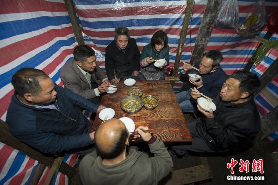因为口味不同,江西工人先行吃饭,3个菜就是10余位江西人的晚餐。杨华峰 摄