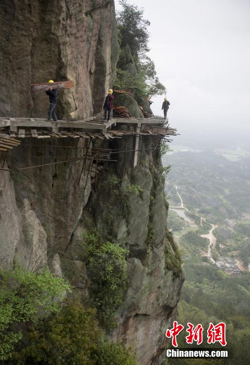 几位工人正在施工现场搬运木材。杨华峰 摄