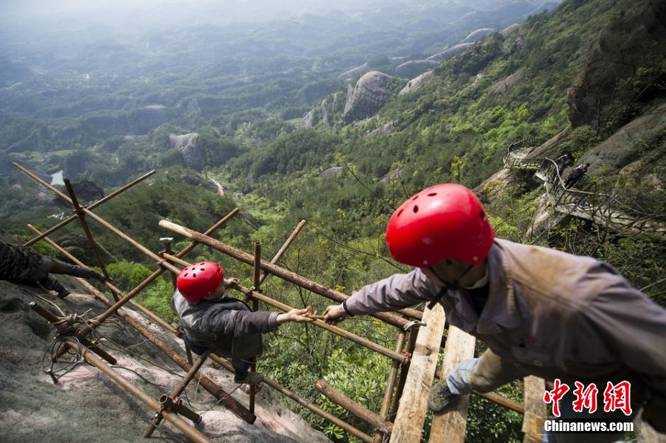 两位搭架工正在只有钢架支撑的悬崖边递送工具。杨华峰 摄