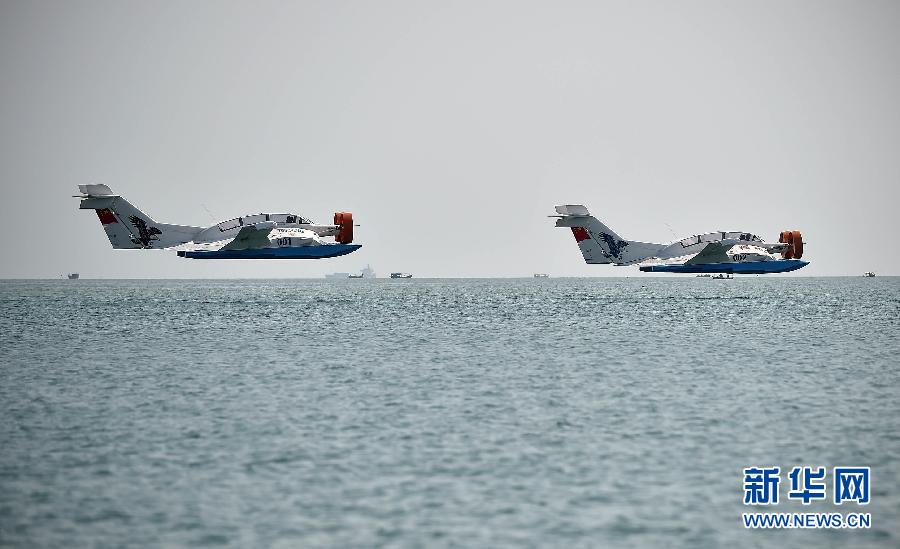 4月16日,两艘CYG-11型地效翼船在海口市附近海域飞行。当日,由海南英格地效翼船制造有限公司制造的两艘CYG-11型地效翼船在海口市亮相并进行飞行展示。地效翼船俗称“水上飞船”,是利用地面效应原理而制成的船只,贴近水面进行低空飞行,CYG-11型地效翼船航速可达每小时210公里。新华社记者郭程摄