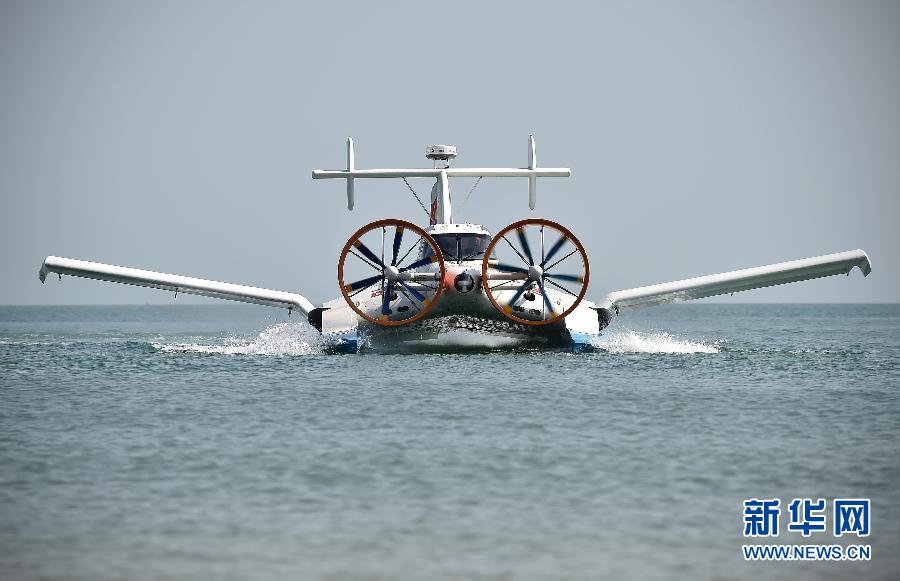 4月16日,CYG-11型地效翼船在海口市附近海域水面降落。当日,由海南英格地效翼船制造有限公司制造的两艘CYG-11型地效翼船在海口市亮相并进行飞行展示。地效翼船俗称“水上飞船”,是利用地面效应原理而制成的船只,贴近水面进行低空飞行,CYG-11型地效翼船航速可达每小时210公里。新华社记者郭程摄