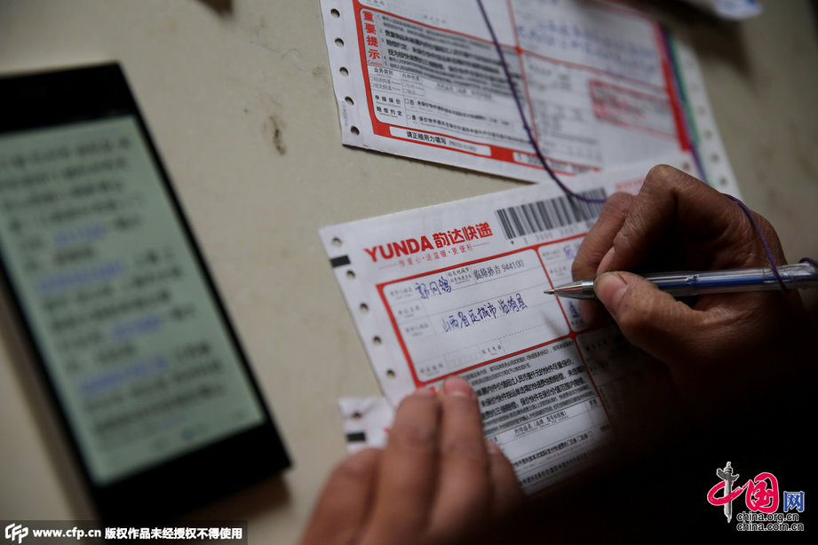 货物运到了快递公司,快递工作人员正在填单,郭向鸽说快递费用太贵,但是没有办法,也很无奈。图片作者:陈卫/CFP