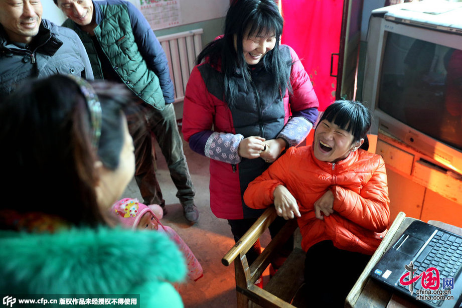 郭向鸽正在和亲戚朋友交流,由于郭向鸽语言障碍,每次说话都很慢,郭向鸽说和她交流会锻炼耐心。图片作者:陈卫/CFP