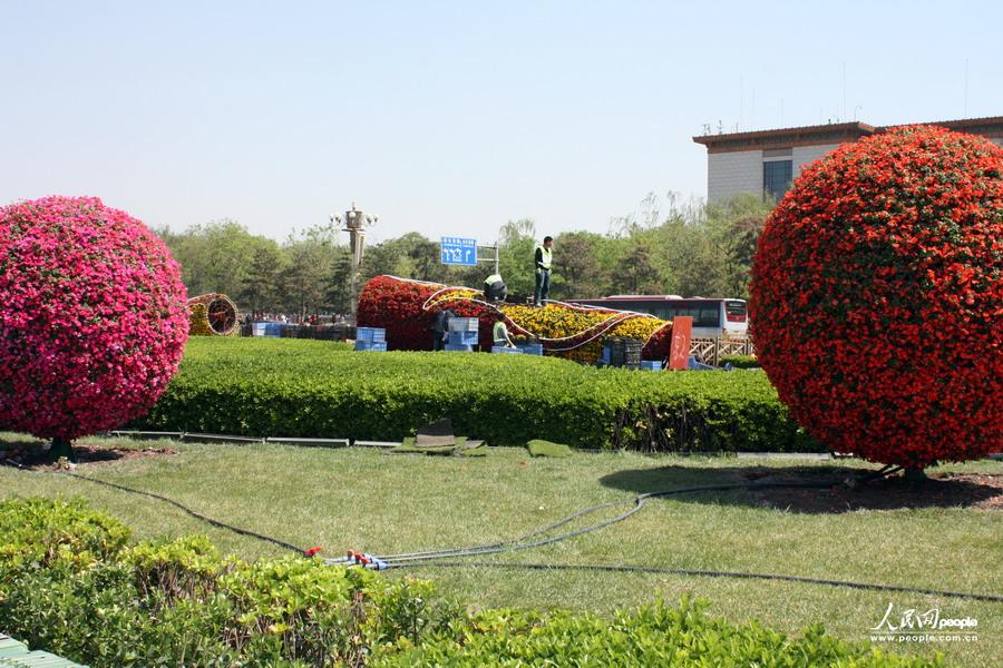 4月24日,天安门广场东侧工人正在布置花柱。诸嘉薇 摄