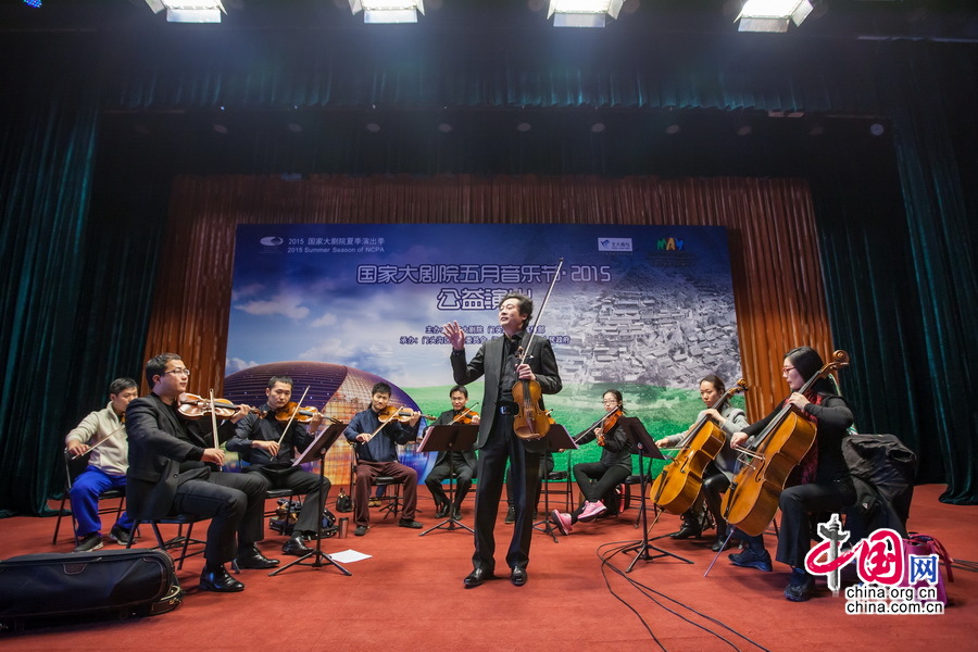 国际小提琴演奏家吕思清与国家大剧院管弦乐团的年轻演奏家们在演出前早早来到演出场地进行排练,尽管演出条件简陋,但是他们依旧一丝不苟的对待。中国网记者郑亮摄影