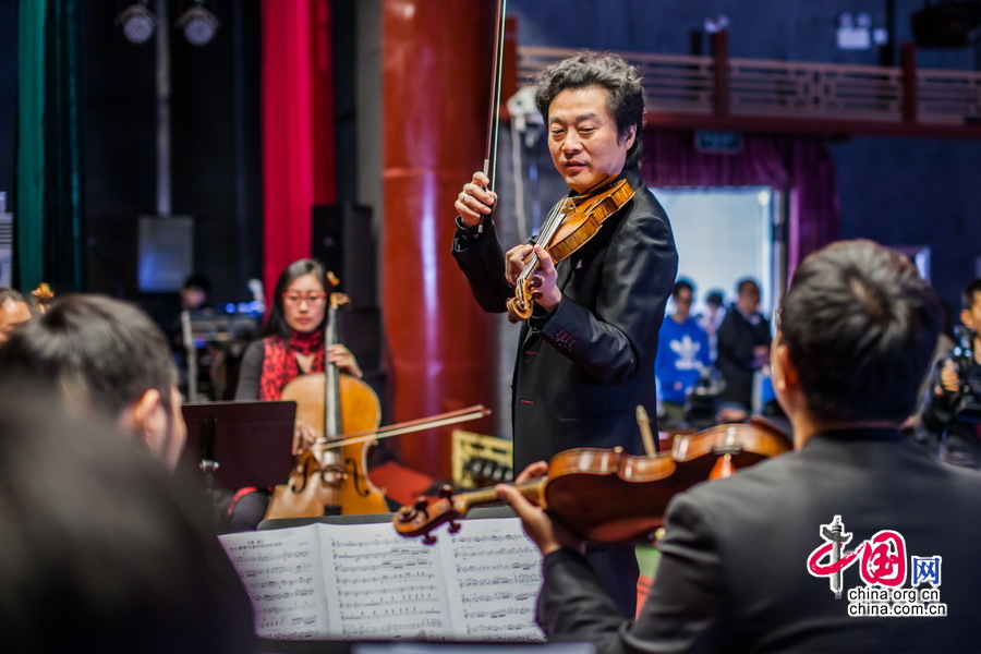 国际小提琴演奏家吕思清与国家大剧院管弦乐团的年轻演奏家们在演出前早早来到演出场地进行排练,尽管演出条件简陋,但是他们依旧一丝不苟的对待。中国网记者郑亮摄影