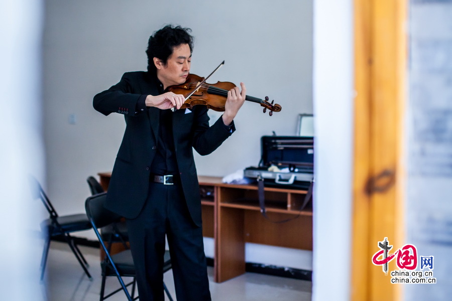 吕思清在自己的休息室进行练习,尽管即将要面对的观众是对古典音乐知之甚少的村民,但他还是要让自己保持一个良好的演出状态。中国网记者郑亮摄影