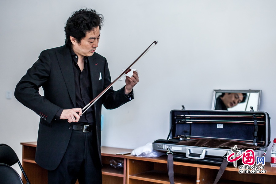 吕思清在自己的休息室调琴,作为国际级的演奏家,他并没有因为演出条件的简陋而放松对自己的要求。中国网记者 郑亮摄影