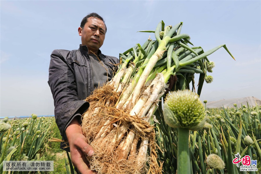 2015年4月28日,河南省滑县慈周寨镇毛白社村西南地,村民毛改善抱着两捆大葱,满脸憔悴叹息道:“这150亩大葱,我要捐献出去,不要钱了!”中国网图片库 作者:毕兴世