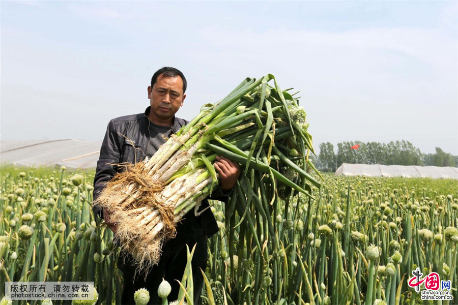 2015年4月28日,河南省滑县慈周寨镇毛白社村西南地,村民毛改善抱着两捆大葱,满脸憔悴叹息道:“这150亩大葱,我要捐献出去,不要钱了!”中国网图片库 作者:毕兴世