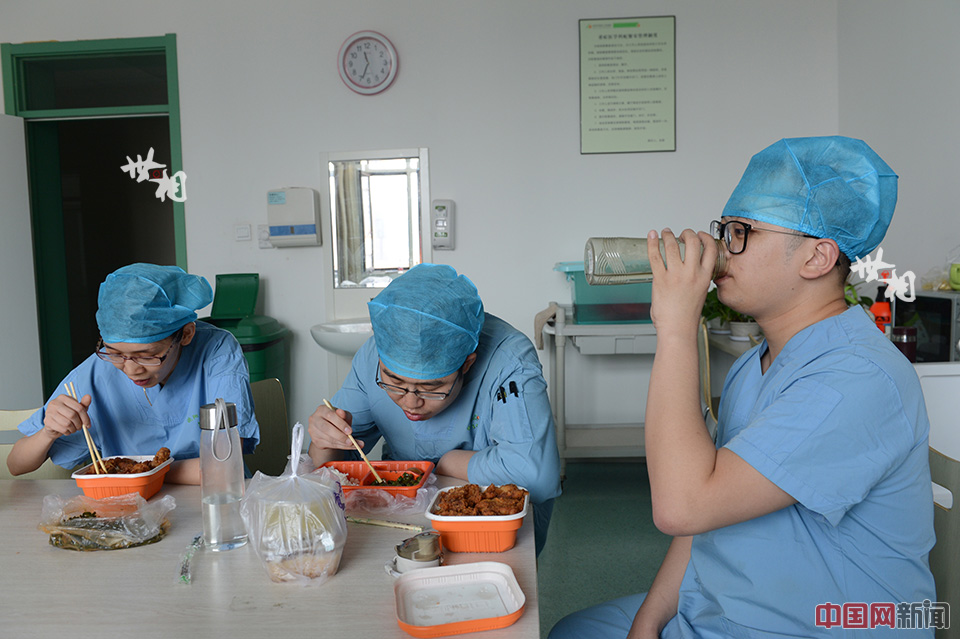 重症监护室医护人员在病房生活区轮换吃午餐,他们只有到了下班时间才能离开病房。