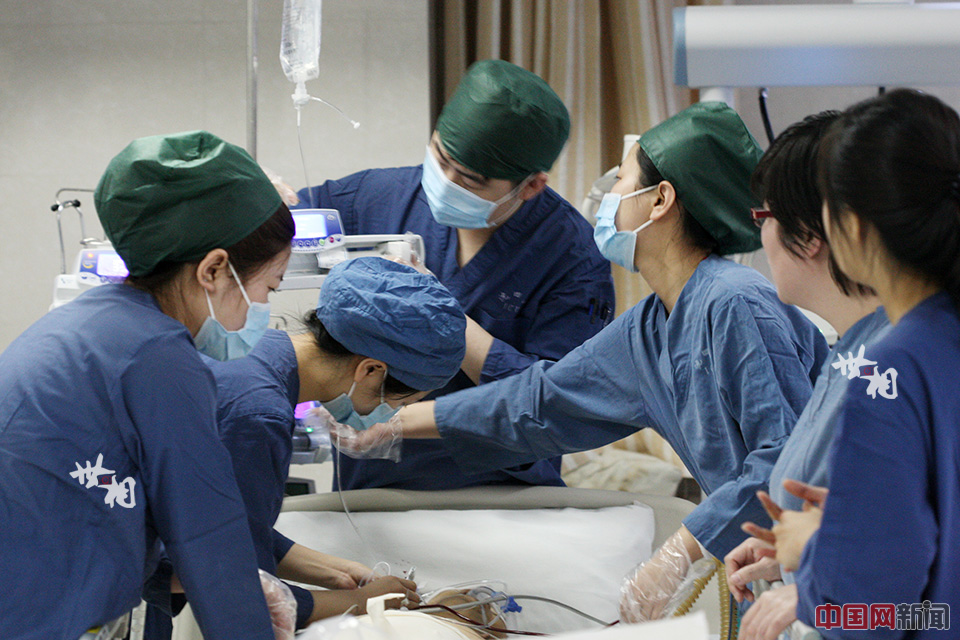 ICU护理小组中至少有一名男护士, 一名刚做完手术的患者推入重症监护室,男护士操作仪器,女护士进行输液、监测等护理工作。