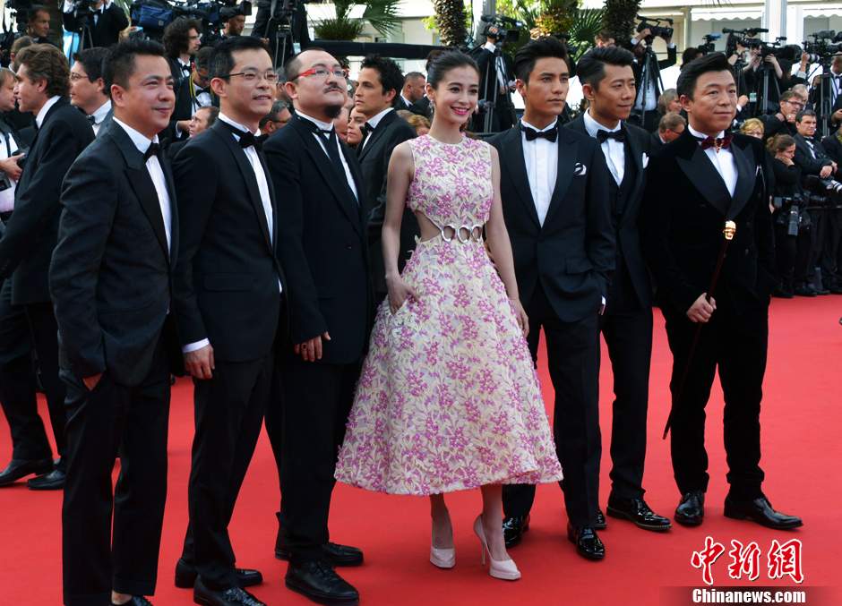 第68届戛纳国际电影节13日在法国南部海滨小城戛纳开幕,一批中国明星出现在开幕式红毯秀上。在本届电影节上,贾樟柯执导的《山河故人》和侯孝贤执导的《聂隐娘》两部华语片参加主竞赛单元,共同向金棕榈大奖发起冲击。图为来戛纳宣传新片《寻龙诀》的主创人员黄渤(右一)、夏雨(右二)、陈坤(右三)、Angelababy(中)和该片导演乌尔善(左三)等踏上开幕式红毯。龙剑武摄