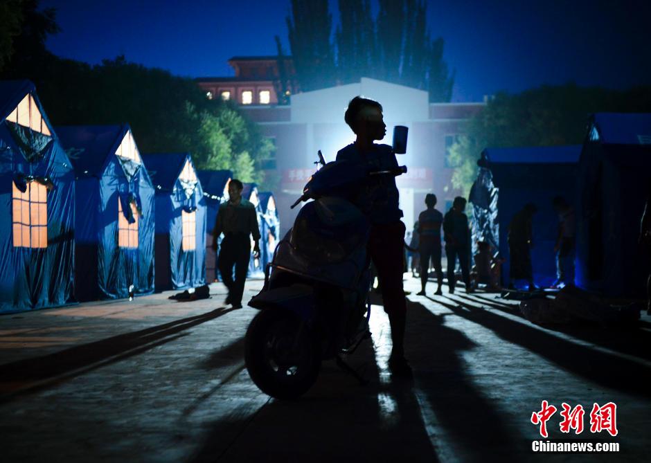 7月4日夜,新疆和田地区皮山县第二中学小学部设置“灾区民众安置点”,一位当地民众骑在摩托车上四处张望,寻找家人。因当天皮山县仍有余震发生,当地政府调拨大批救灾帐篷,在保障人身安全的空地设置“灾区民众安置点”,并为民众准备了矿泉水、方便面等应急物资。中新社发刘新 摄