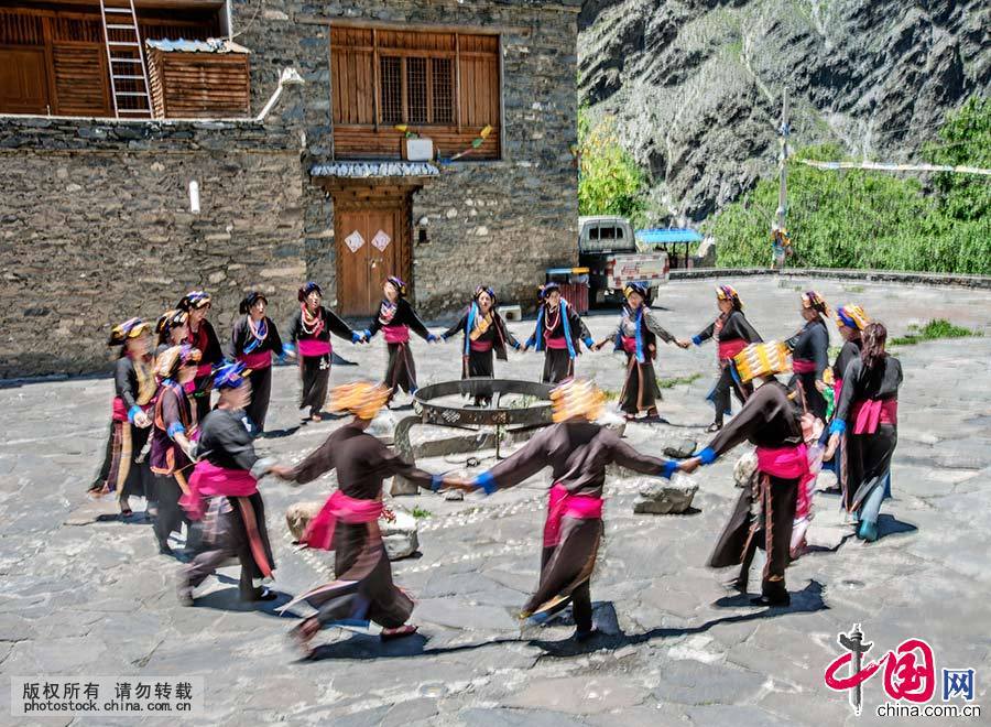喜庆之日全寨老幼群集晒坝,手牵手、肩并肩,圈跳藏式锅庄舞,沉浸于团结、喜庆的隔世桃源。中国网图片库 刘国兴 摄