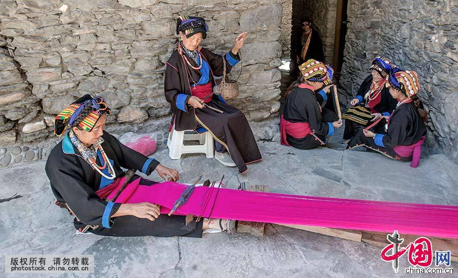 当地民间手工艺术-氆氇。氆氇为藏语音译,是手工生产的一种羊毛织品,可以做床毯、衣服等。中国网图片库 刘国兴 摄