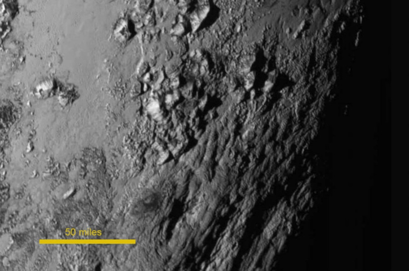 人民网旧金山7月15日电(韩莎莎)7月15日,美国太空总署NASA冥王星探测器“新视野号”传回最新冥王星照片。在冥王星赤道附近的特写图片中,发现了一座高为3500米的年轻山脉。