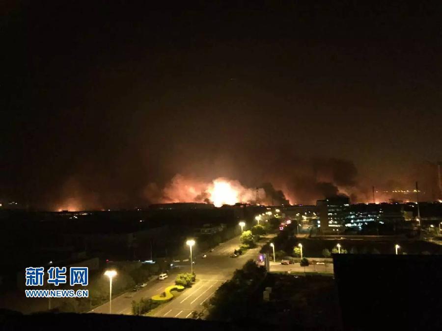 8月13日,天津滨海新区开发区周边瑞海危险品仓库爆炸现场火光冲天。 12日23时30分左右,天津滨海新区开发区周边瑞海危险品仓库发生爆炸。爆炸喷发火球,同时引发周边企业二次爆炸,方圆数公里有强烈震感。新华社记者岳月伟摄