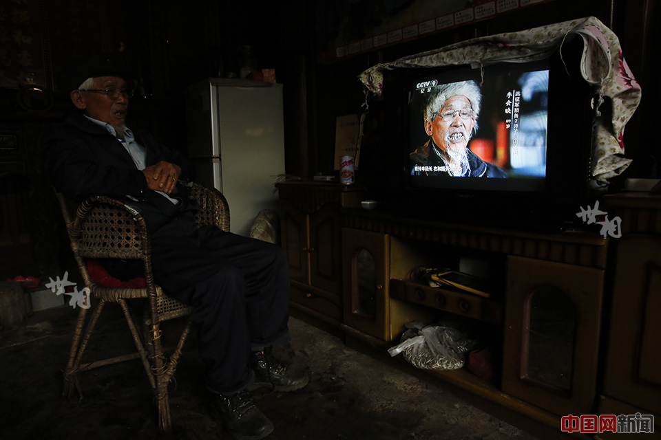 夜晚,抗战老兵李会映看央视正在播出大型记录片《腾冲.腾冲》,节目出现对他采访的画面。