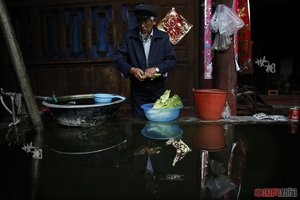 李会映清洗白菜,老人经常中午多做一些食物,把晚上的饭菜也带出来。