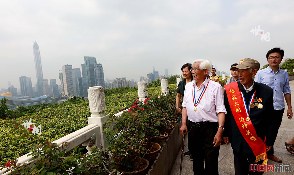 2015年8月21日,抗战老兵李会映和张体留兴致勃勃地瞩目着高速发展中的深圳。深圳中兴通讯公益基金会持续十年关注滇西抗战老兵,8月22日,中兴通讯公益基金会举办中国远征军滇西抗战老兵图片展,邀请李会映(左)和张体留两位抗战老兵参加图片展。