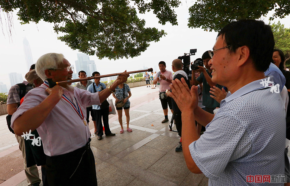 2015年8月21日,深圳莲花山公园,被成为神枪手的李会映老人为市民讲述当年击毙日军的场景。