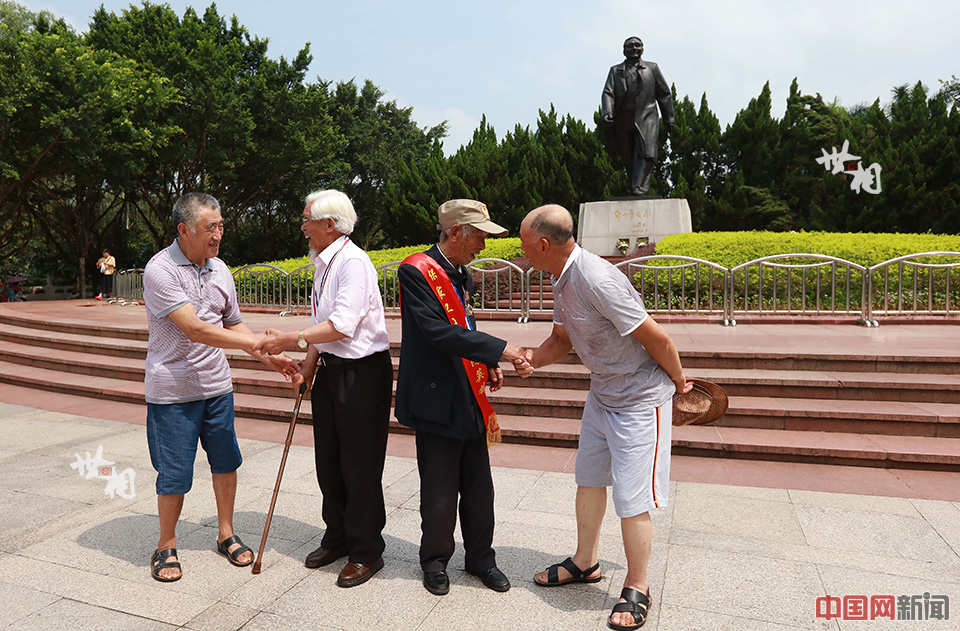 2015年8月21日,深圳莲花山公园,市民主动和抗战老兵李会映(左二)张体留老人握手致敬。