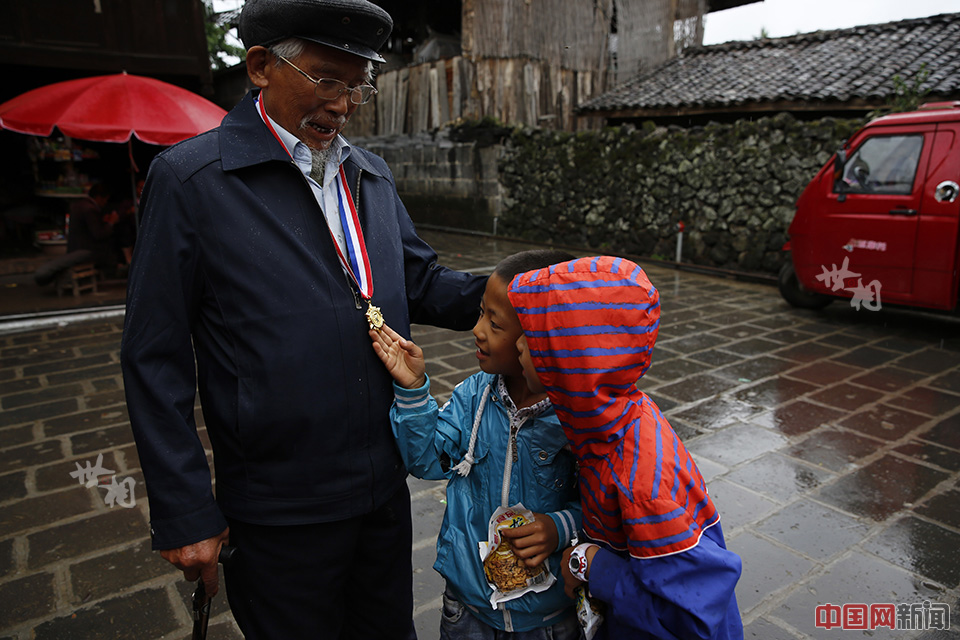村里的孩子好奇地察看李会映老人的抗战胜利70周年的纪念牌,老人经常教育村里的孩子要牢记日本侵略中国的历史。