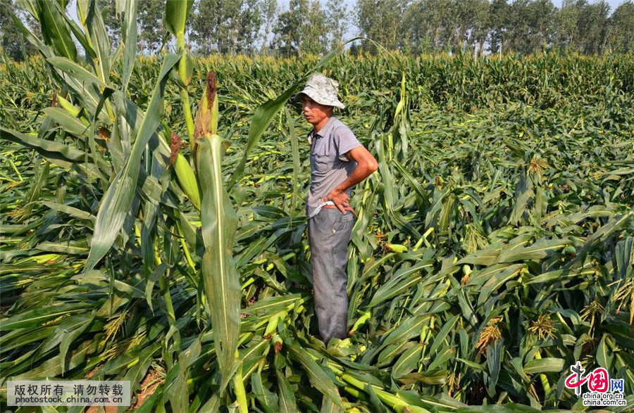 2015年8月23日,河南滑县万古镇村民,站在自己9亩全部倒伏的玉米田里发呆。中国网图片库 作者:孙渺海