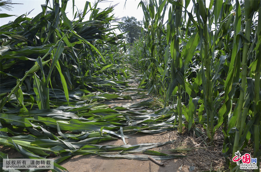 2015年8月23日,河南滑县万古镇倒伏的玉米成排趴在田间的小路上。中国网图片库 作者:孙渺海