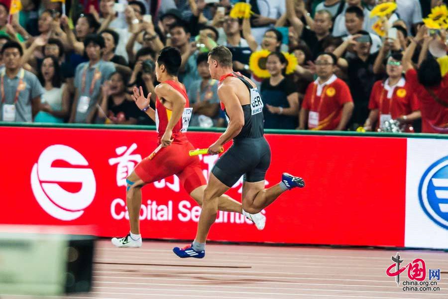 中国队以38秒01的成绩获得2015年国际田径锦标赛男子4X100米接力决赛银牌,图为比赛现场。 中国网记者 郑亮摄影
