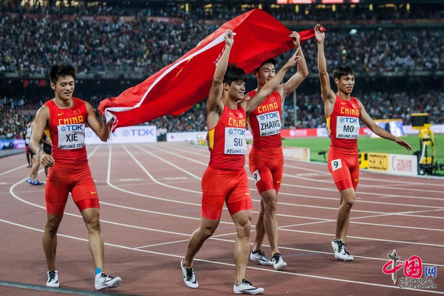 中国队以38秒01的成绩获得2015年国际田径锦标赛男子4X100米接力决赛银牌,赛后队员们庆祝胜利。 中国网记者 郑亮摄影